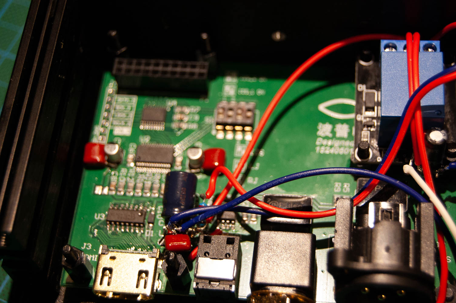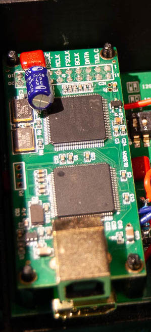 To help the board out beyond clean power l see the need to add a number of additional capacitor filtering, for instance 5V in only has a single 10uf cap, so I added another 220uf low esr electrolytic and 100nf film cap. Similarly the 3.3V rail only had a couple 10uf cos so paralell Ed then with 100nf caps, less important here since that rail only powers the switching and line stage in splitting out the signal. Instead the 3.3v power of the Anamero USB card gets 47uf low esr electrolytic and 100nf film cap for filtering.