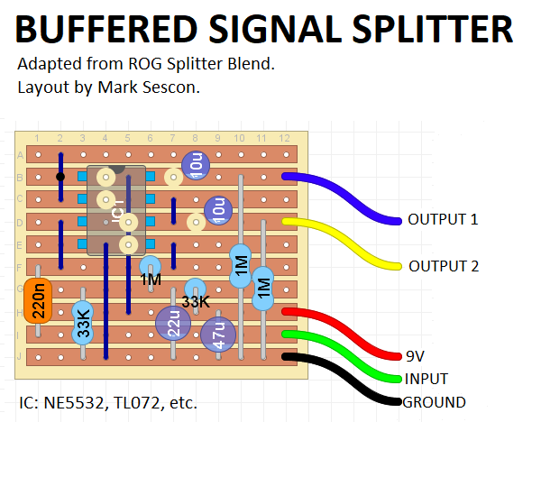 Right up front I want to clearly communicate that an absolutely required mod to the base schematic is to increase coupling caps, the original schematic has them set so low they only allow for the absolute tinniest restrictive conception of what a guitar sound should be, completely un-usable in my opinion. That did come as a surprise since I based this of a old classic, the runoff groves splitter and blender, as other have. So raising the 220nF input cap seen below to 1uf was a good first step, next I noted increasing it to 3.3uf did help further so that’s the final value, required absolutely if using with tuned down instruments for sure.