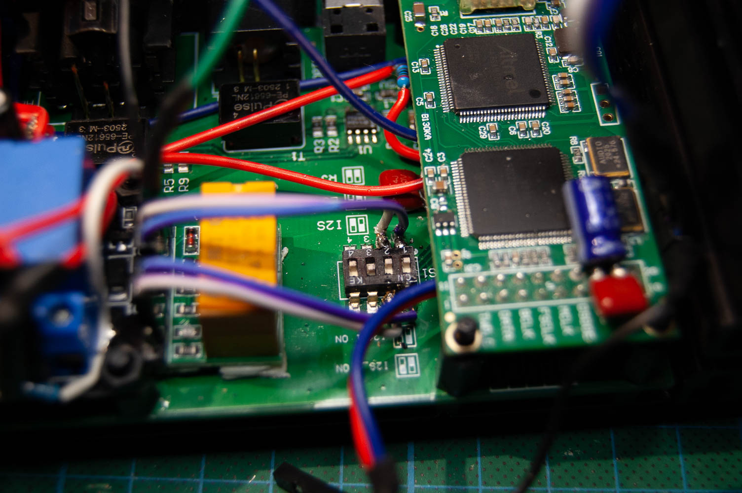 I chose a DPDT, double-pole, double-throw, relay since the dip switches to select input was configured such, so some quick and dirty tiny soldering later, hooked to a relay module this should in theory switch to Bluetooth once someone connected to it. I did find a note saying the unit in question should trigger on minimum 2.8V so should be fine.